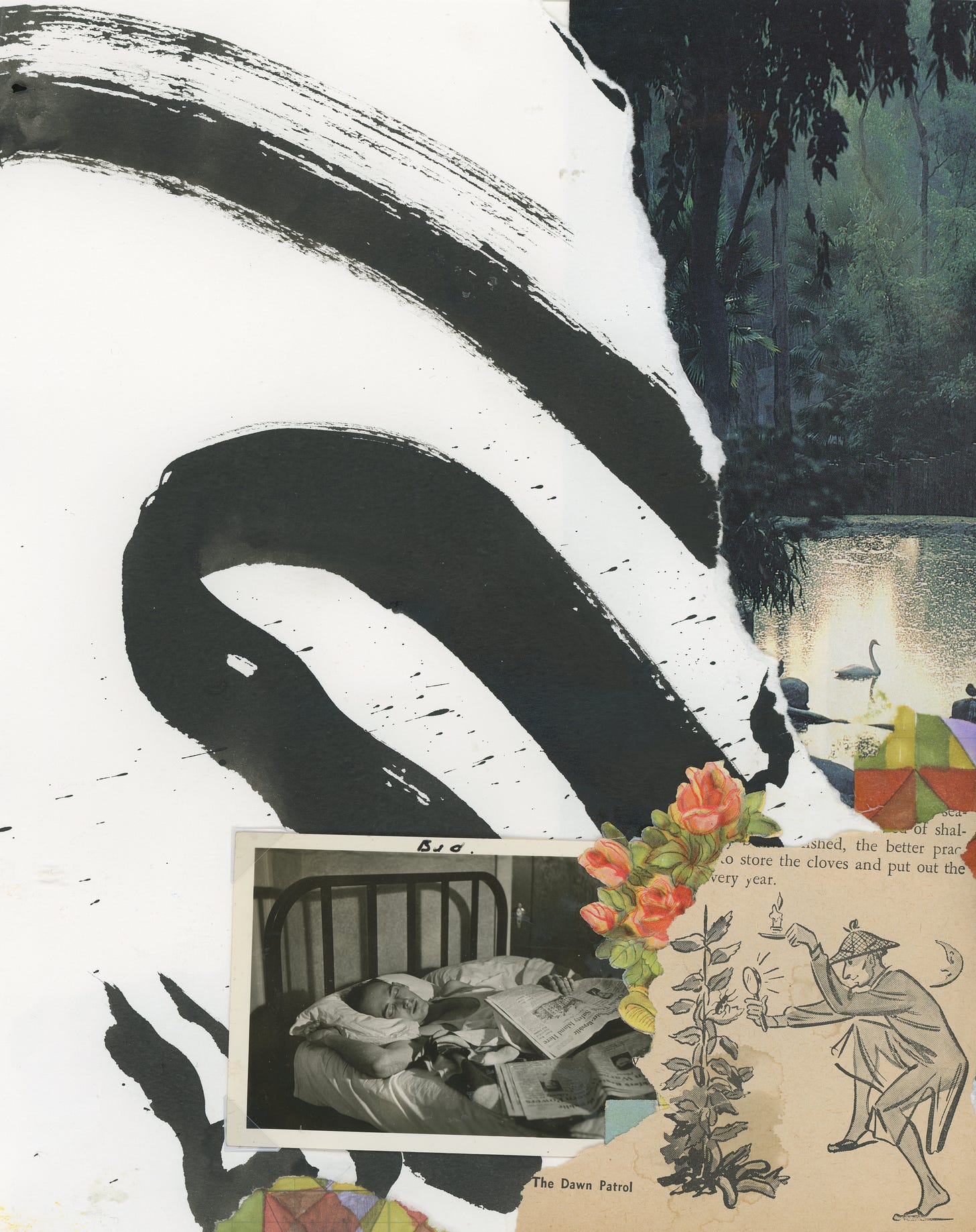 This collage is a slow meditation on rest and information overload. It lingers on the question: Is knowledge accumulated through careful study, or does it arrive in dreams? Why not both?